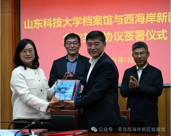 随后,青岛西海岸新区档案馆副馆长蒋晓磊与山东科技大学档案馆副馆长靳文娟代表双方签署《合作共建框架协议》,并向山东科技大学档案馆赠送编研成果。根据协议,双方将在档案资源共享、档案科技创新、思政教育合作、人才培养交流等方面开展深度合作,携手打造校地档案合作的示范样板。