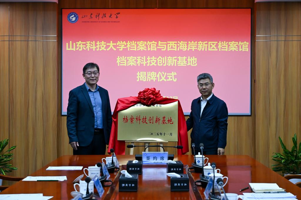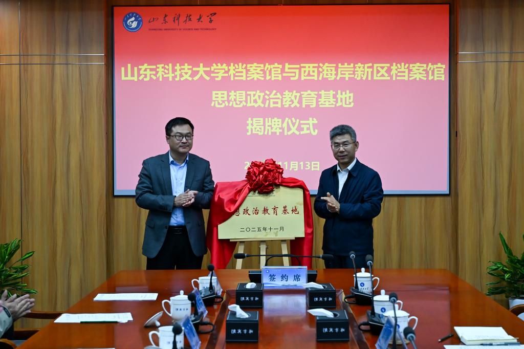 随后,靳文娟与蒋晓磊代表双方签署《合作共建框架协议》,秦昌盛与薛增峰共同为“档案科技创新基地”揭牌,王鑫与薛增峰共同为“思想政治教育基地”揭牌。签约揭牌仪式后,双方围绕档案资源共享、档案编研与开发利用、档案科学研究、思政育人等有关事项交换意见,达成多项合作共识。