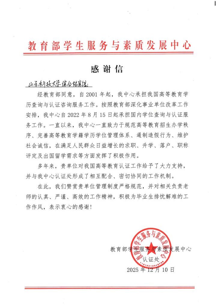 12月10日,教育部学生服务与素质发展中心(以下简称“中心”)发来感谢信,对学校档案馆在我国高等教育学历查询与认证咨询服务工作中给予的大力支持表示高度认可与感谢。该项工作已连续5年受到教育部表扬。