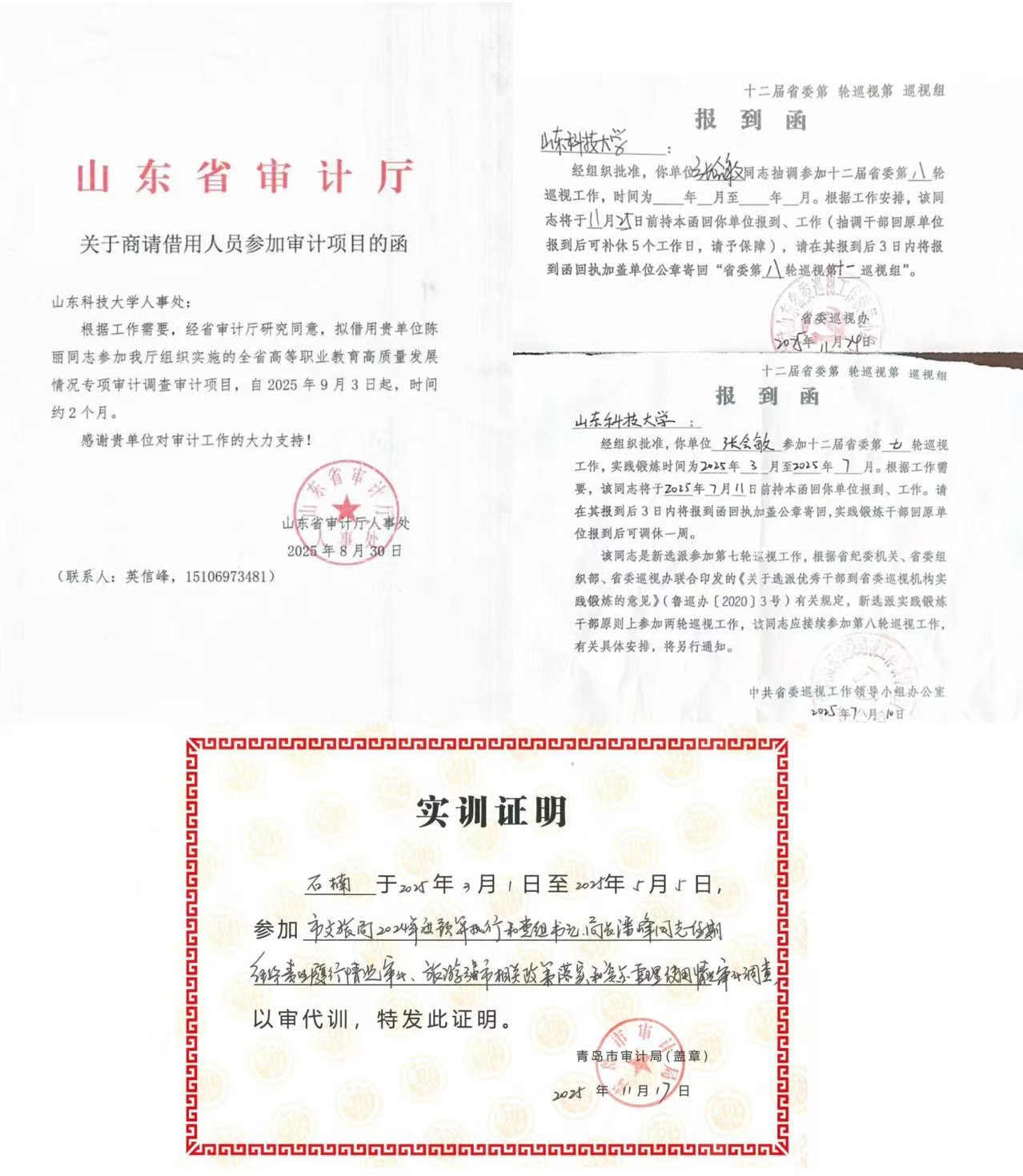 坚持严管厚爱结合,强化队伍专业能力建设,打造政治坚定、业务精通、作风务实的审计铁军。2人次借调省委巡视组、1人借调省审计厅、1人借调青岛市审计局参与专项工作,4人次协助学校纪委审查工作,3人参加校内巡察,1人到财务处开展业务实践,通过“以干代训”积累实战经验。参加山东省审计厅举办三期“内部审计大讲堂”视频培训会议,组织16人次参加省教育厅、教育审计学会组织的工作会议及业务研讨,拓宽专业视野。