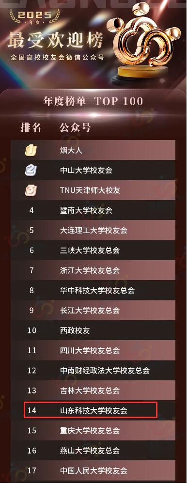 在备受关注的“2025年度校友会微信公众号100强”总榜单中,山东科技大学校友会公众号荣列全国第30位。同时在分项榜单中表现亮眼:在反映用户互动与忠诚度的 “最受欢迎校友会微信公众号”榜单中高居全国第14位,“最具传播力校友会微信公众号”榜单中位列全国第45位。这一系列排名,全面体现了公众号在内容质量、传播广度与校友凝聚力方面的均衡实力与卓越表现。