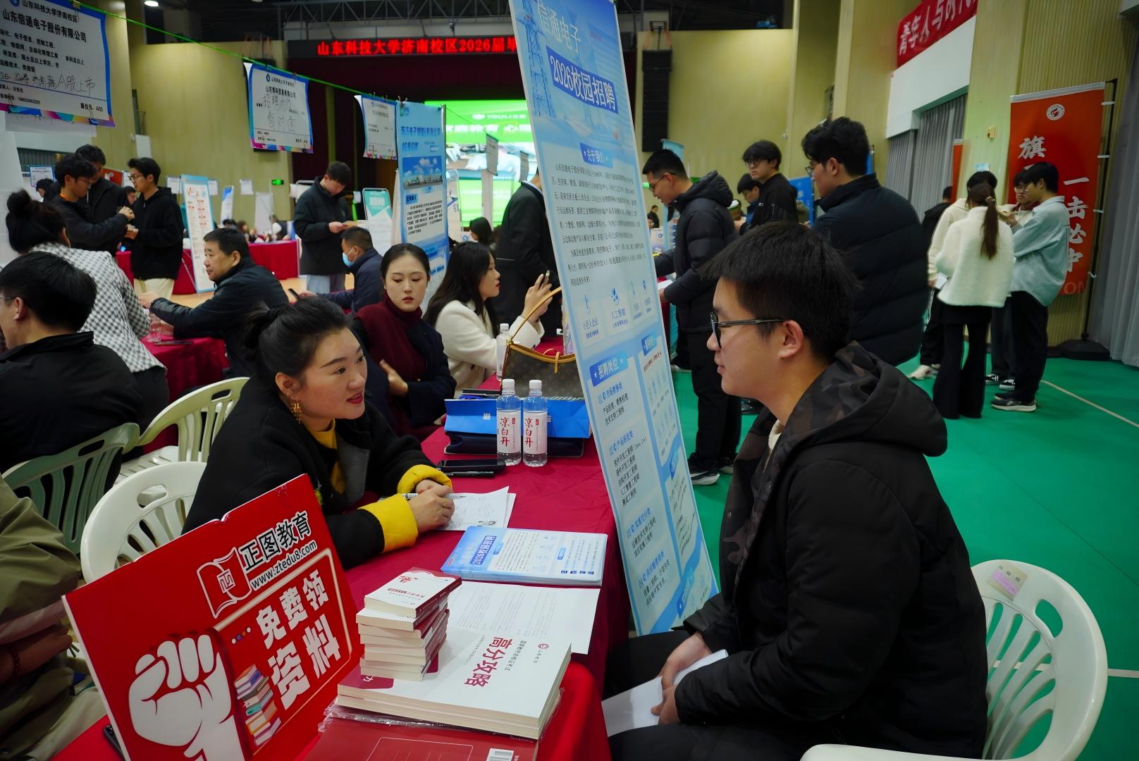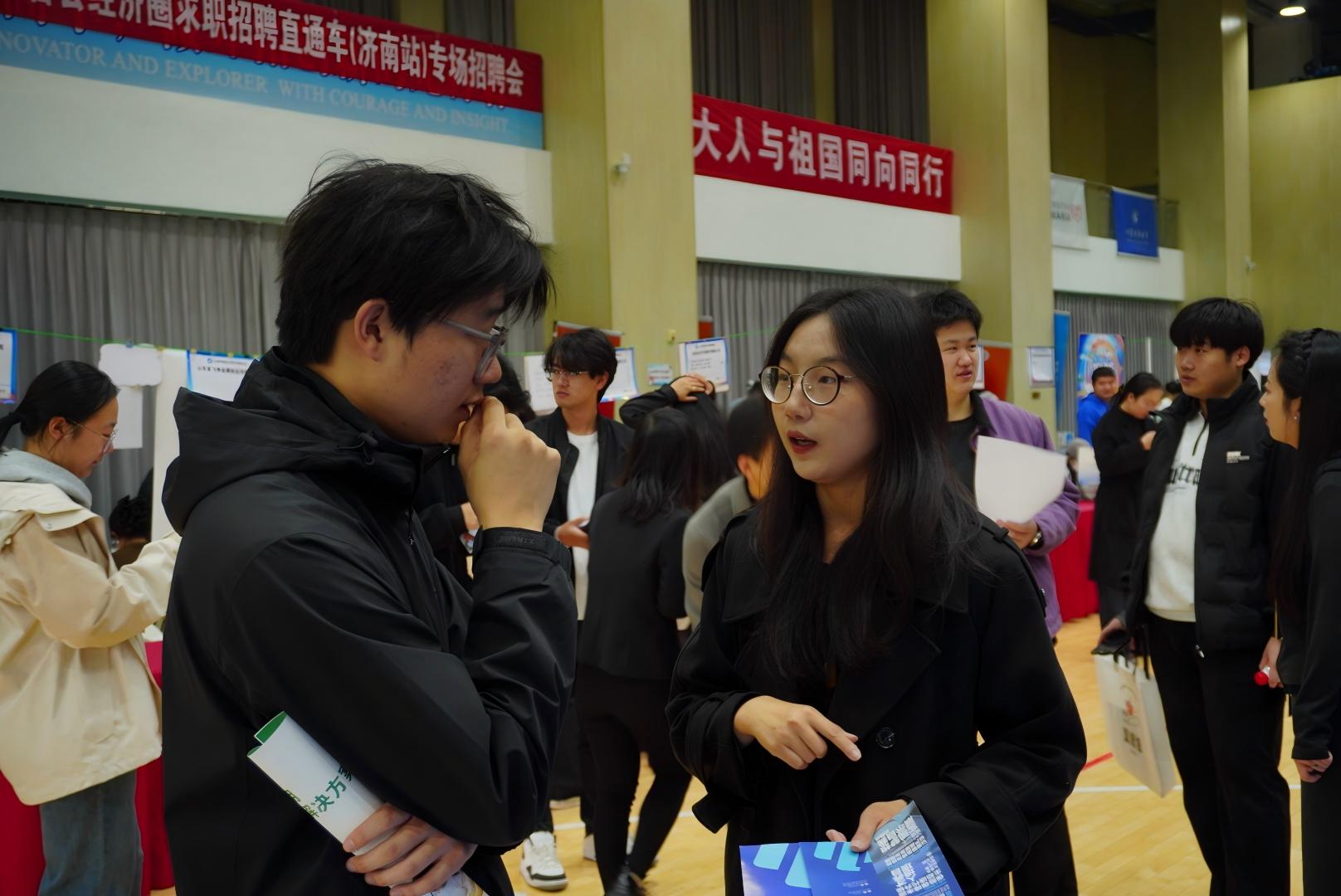 11月15日,山东科技大学济南校区2026届毕业生校园双选会暨山东省会经济圈求职招聘直通车(济南站)专场招聘会在艺体楼二楼顺利举行。校区党委书记梁赛江、主任郭加书,校区党委委员仉兴泉、毛庆东、施宙等到招聘会现场,与用人单位以及求职学生亲切交流,了解企业用人需求和学生求职意向,积极推介校区毕业生。