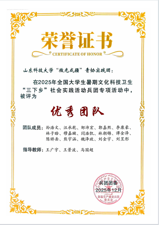 近日,2025年全国大学生暑期文化科技卫生“三下乡”社会实践“卫国戍边兵团行”兵团专项活动顺利结项。由济南校区师生组成的山东科技大学“微光戍疆”青协实践团(指导教师:王广宇、王景波、马国超)成为学校首次入选该专项活动的团队,并在全国高校152支入选实践队伍中脱颖而出,荣获“优秀团队”荣誉称号。实践团围绕“青春助力兵地融合,数字赋能乡村振兴”为主题,深入新疆生产建设兵团基层一线开展调研实践,形成了一系列具有现实针对性和实践价值的成果,充分展现了济南校区在社会实践和实践育人方面的扎实成效。