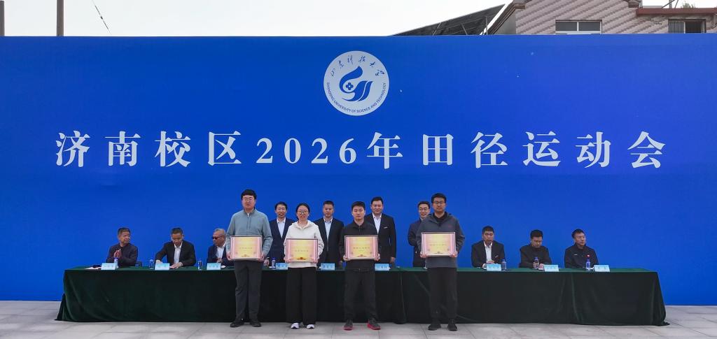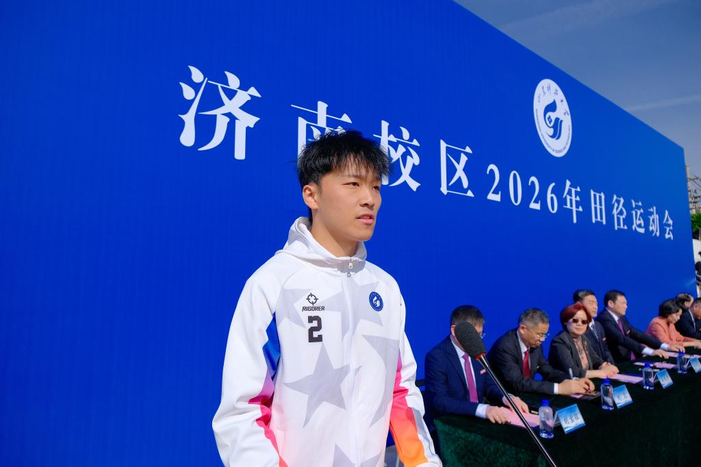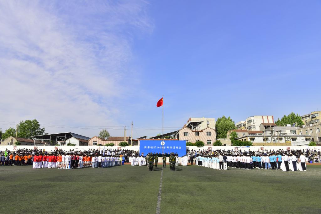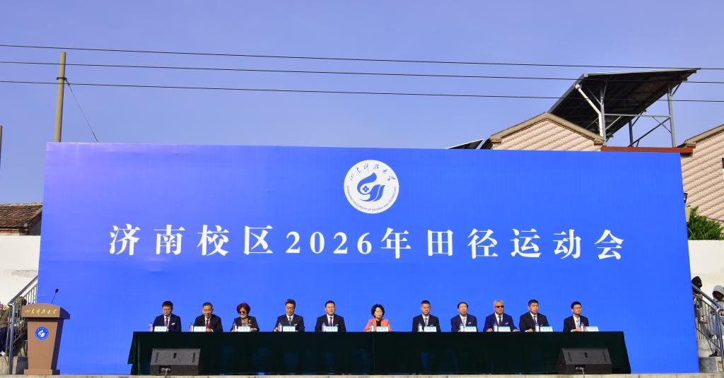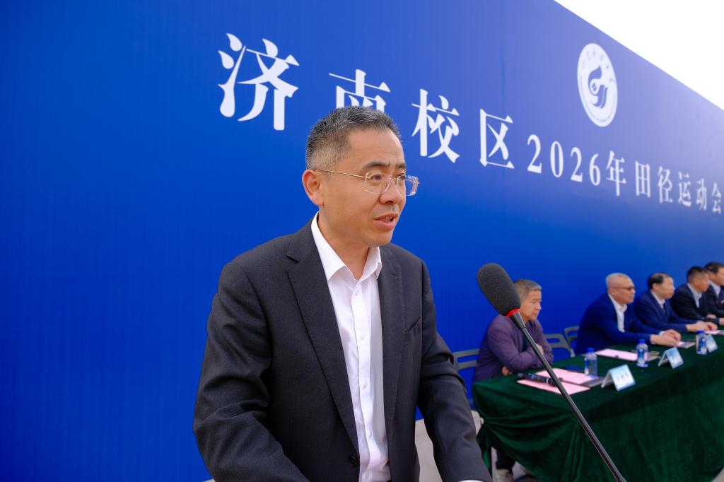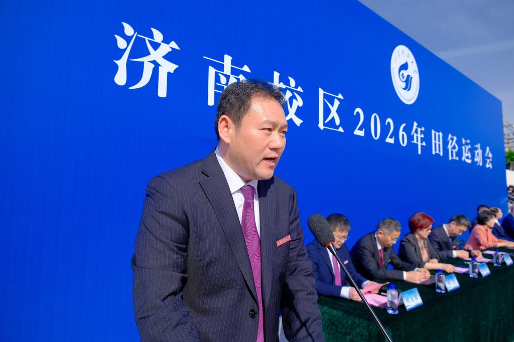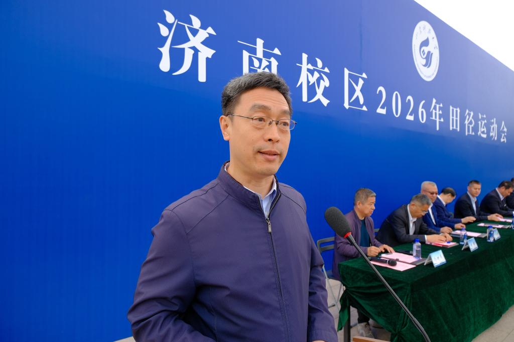 4月28日,济南校区举办2026年田径运动会。校党委副书记郭益灵、校区党委班子成员出席开幕式并在主席台就座。开幕式由校学生工作处副处长(驻济)胡宝征主持。