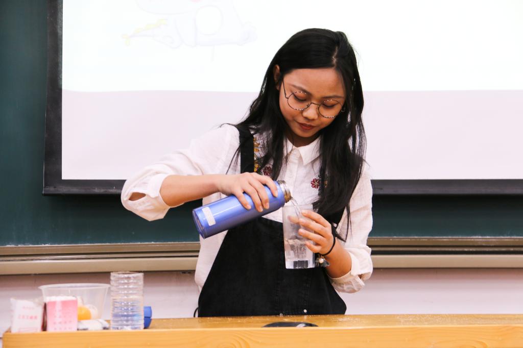 本次宣讲比赛以科学小课堂为主题,旨在增加小学生对科学文化的兴趣和对科学探索的热情,更好地助力他们健康成长。初赛的33组选手中,有11组选手脱颖而出进入决赛。参赛选手用通俗生动的语言讲述了静电、密度、折射等科学现象,并利用道具生动地演绎出来。赵明同学利用泡腾片、油和水为同学们展示了“火山喷发”;郑采苹组利用纸巾摩擦绳子,使绳子震动并带动周围空气以及纸杯的震动,向同学们讲述了振动发声的原理;吕东洋组则展现了“筷子折了”“鸡蛋漂浮”等现象。选手们在讲课过程中积极与评委、观众进行互动,让在场的同学都能近距离的感受到科学小实验的魅力。最后,各位评委根据参赛选手的宣讲情况进行打分,评选出一等奖两名,二等奖四名,三等奖五名。