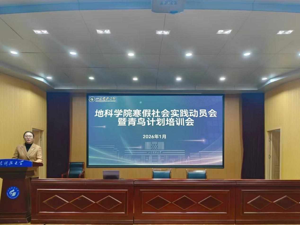 为推进2026年寒假社会实践活动顺利开展,引导和帮助学生上好与现实相结合的“大思政课”,1月15日,地科学院于J6-434举办寒假社会实践动员会暨青鸟计划培训会。校团委张昔玉老师应邀为学生作专题培训,学院团委辅导员杜中文、2025级全体本科生参加,学院团委书记王文鑫主持会议。