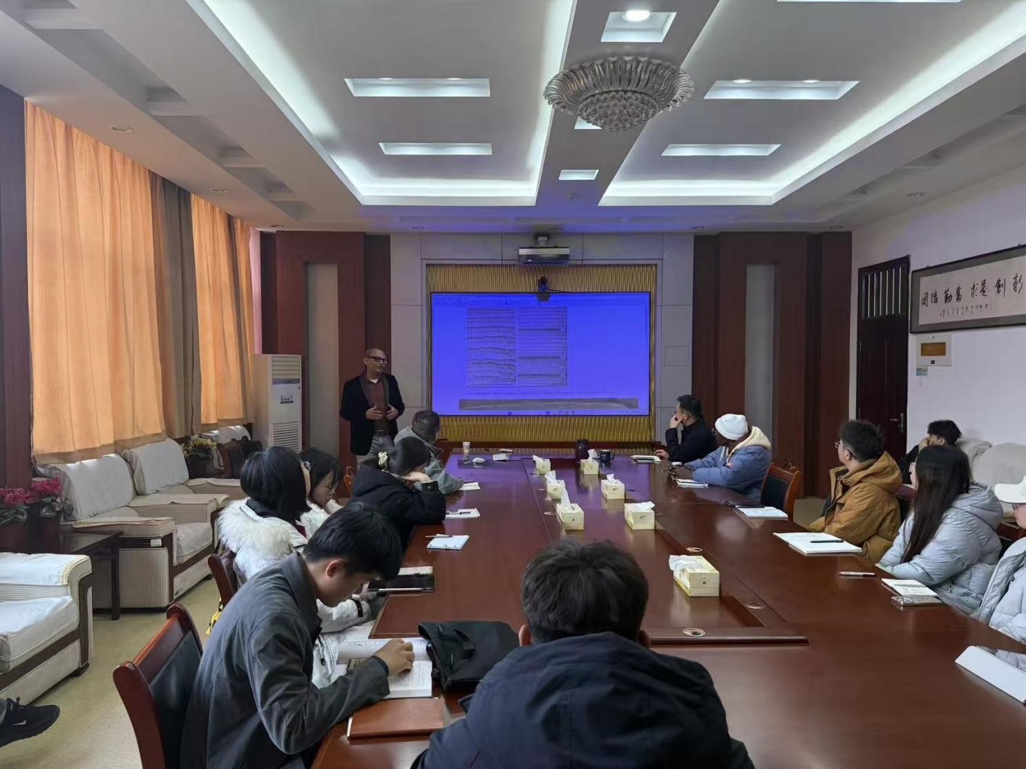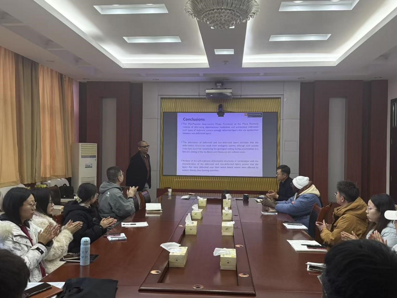 师生们围绕潮汐韵律层的野外识别难点、震积岩与其他沉积构造的区分方法、深海地质记录的研究手段等问题,开展了深入研讨。Rajat Mazumder教授结合自身科研经历,逐一细致解答,针对不同研究方向的师生给出了针对性的研究建议,现场学术氛围浓厚,交流探讨热烈。