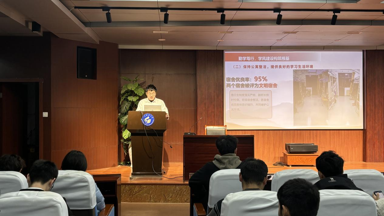 机械设计制造及其自动化2023-5班宣讲人白远兴分享了班级“学风+文明”的建设成果:党团骨干达12人,曾获评“先进班集体”“五四红旗团支部”。班级必修课通过率与优良率居专业前列,超三分之一成员跻身专业前三十;宿舍优良率达95%,两个宿舍获评文明宿舍;依托专业优势,班级斩获科技竞赛国家级奖项十余项、省级奖项百余项,尽显集体凝聚力。