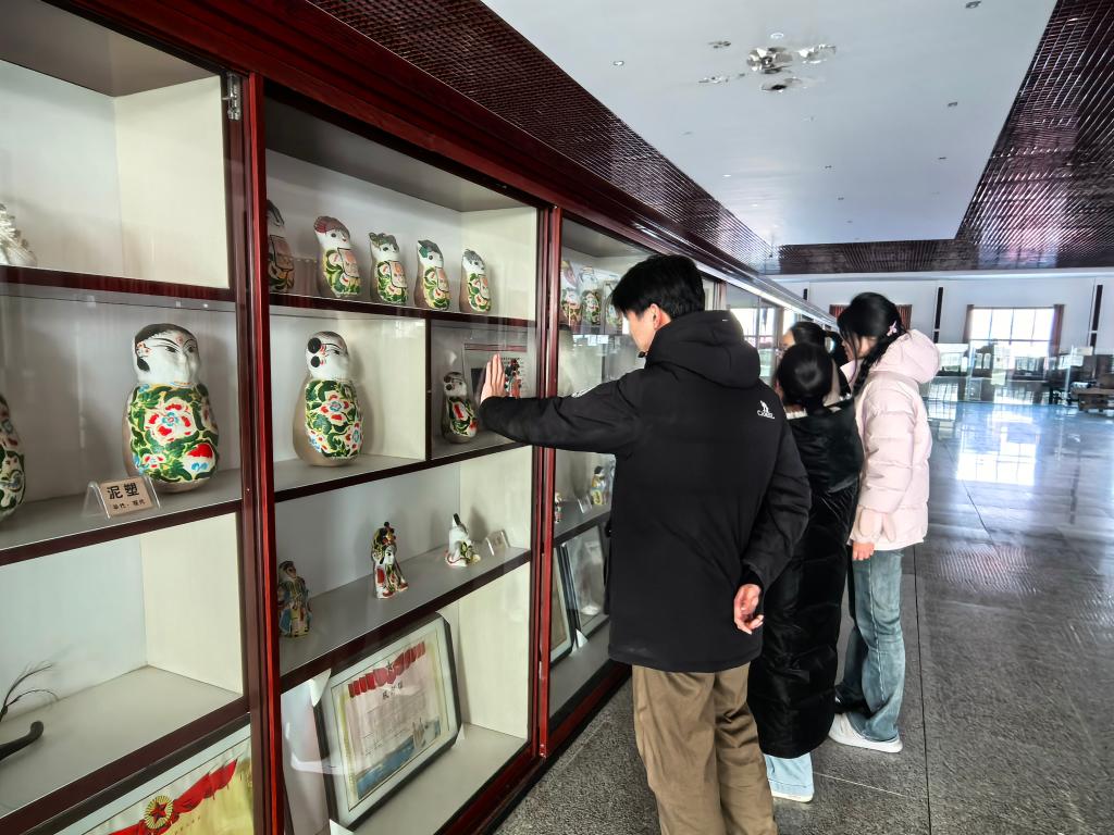 形态各异的泥塑作品格外吸睛,年味浓厚的童子造型憨态可掬,猪八戒背媳妇的场景趣味十足,北京奥运会吉祥物福娃的造型则留存着时代记忆,件件作品色彩鲜活、神态生动。随着队员们的脚步深入,木雕作品尽显匠人功力。一块木板之上浮雕层层递进,人物与景致栩栩如生,展开如一幅立体画卷。