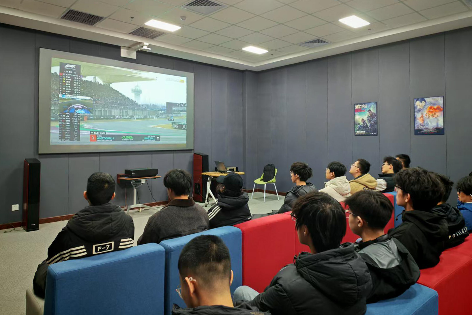 随后播放的F1技术科普短片,围绕发动机内部构造、变速箱工作原理、车身材料应用等内容展开,展示了活塞运动、曲轴传动、齿轮啮合等机械结构的实际工作状态,不少同学边看边讨论。