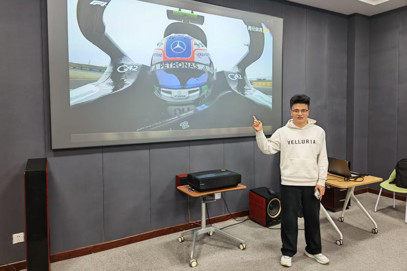 本次活动结合2026赛季F1中国大奖赛赛事节点,通过观看比赛片段和现场讲解,引导学生从机械工程视角观察F1赛车背后的技术细节。现场播放了F1中国大奖赛正赛片段,学生会成员结合画面进行实时解说,重点引导同学们关注赛车的底盘结构、传动机构以及弯道中的力学表现。“大家看这个弯道,赛车能保持稳定过弯,和悬架的几何设计、整车的重心分布都有关系。”解说同学对照画面讲解道。