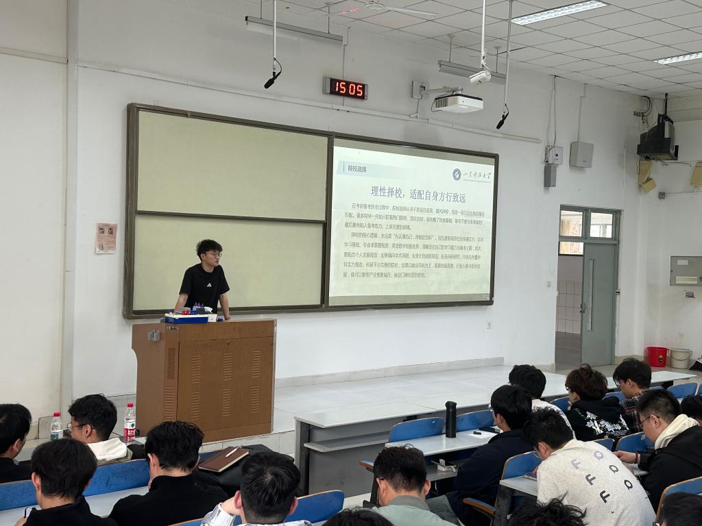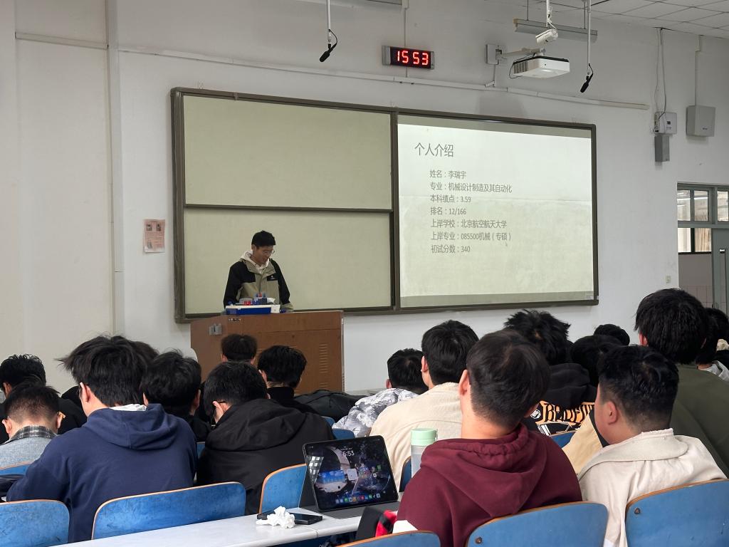 会上,5位嘉宾结合自身备考实战,围绕院校专业选择、公共课与专业课复习规划、时间管理、心态调整等核心内容展开细致分享。其中,汪昊天、李崇拧、李瑞宇、滕明强、张智博,分别从不同分数段、不同院校层次、学硕与专硕不同赛道,拆解了机电类专业考研的复习重难点、真题运用技巧与择校要点,为不同基础、不同目标的同学提供了多元参考。课下,同学们积极地向学长们提问,学长们耐心解答。