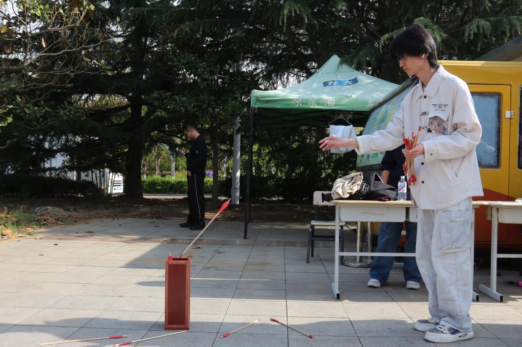 活动以“关爱自我,释放压力”为主题,引导同学们在趣味互动中学会心态调整,积极面对学习和生活。现场设有“烦恼纸飞机”“气球保卫战”和“投壶”三项游戏,参与者可赢取印章奖励。“烦恼纸飞机”中,同学们在便签上写下烦恼折成纸飞机放飞,借此释放情绪;“气球保卫战”需两人一组,在保护己方气球的同时设法踩破对手气球,现场充满欢声笑语;“投壶”游戏则考验专注力,投入箭矢即可获得成就感,帮助心情平复。
