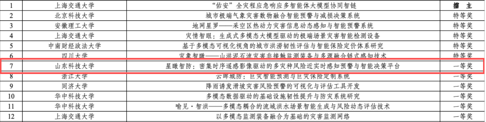 近日,第十九届“挑战杯”全国大学生课外学术科技作品竞赛2025年度揭榜挂帅擂台赛人工智能领域终审主擂台赛于10月17日至20日在上海市徐汇区举办。计算机学院嵙大哨兵团队(成员:杨凯迪、孙旭升等;指导教师:于建志、崔宾阁、乔虎)凭借参赛项目《星瞰智防:密集时序遥感影像驱动的多灾种风险近实时感知预警与智能决策平台》,在激烈竞争中脱颖而出,荣获国家级一等奖,实现了学校在该赛项上的历史性突破!