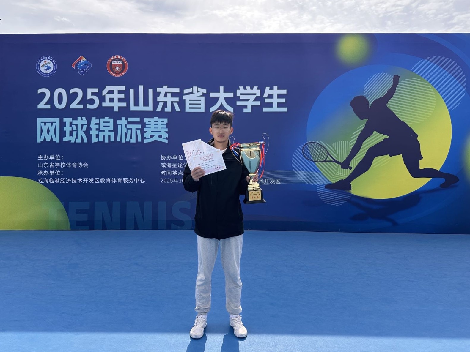 近日,2025年山东省大学生网球锦标赛在威海临港海思网球中心落幕。我院电气工程及其自动化2022级4班尹智博代表学校参赛,凭借出色发挥,一举获得甲组男子团体冠军、男子双打冠军与男子单打季军的优异成绩。