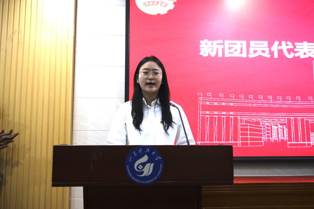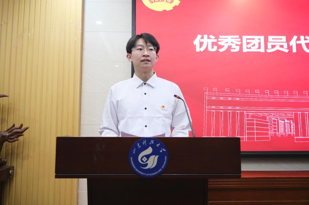 硕研2024级王梦瑶作为新团员代表发言,她承诺将以“有理想、敢担当、能吃苦、肯奋斗”为准则,把团旗誓言化为实际行动,在民族复兴征程中挺膺担当。优秀团员代表宋宜庭以志愿服务、学科竞赛经历为引,向新团员传递榜样力量,他回忆入团时的画面,直言“团徽不只是荣誉,更是沉甸甸的责任”,同时勉励新团员:笃定理想、扎根成长,把个人路融入国家路,牢记“请党放心,强国有我”的誓言。