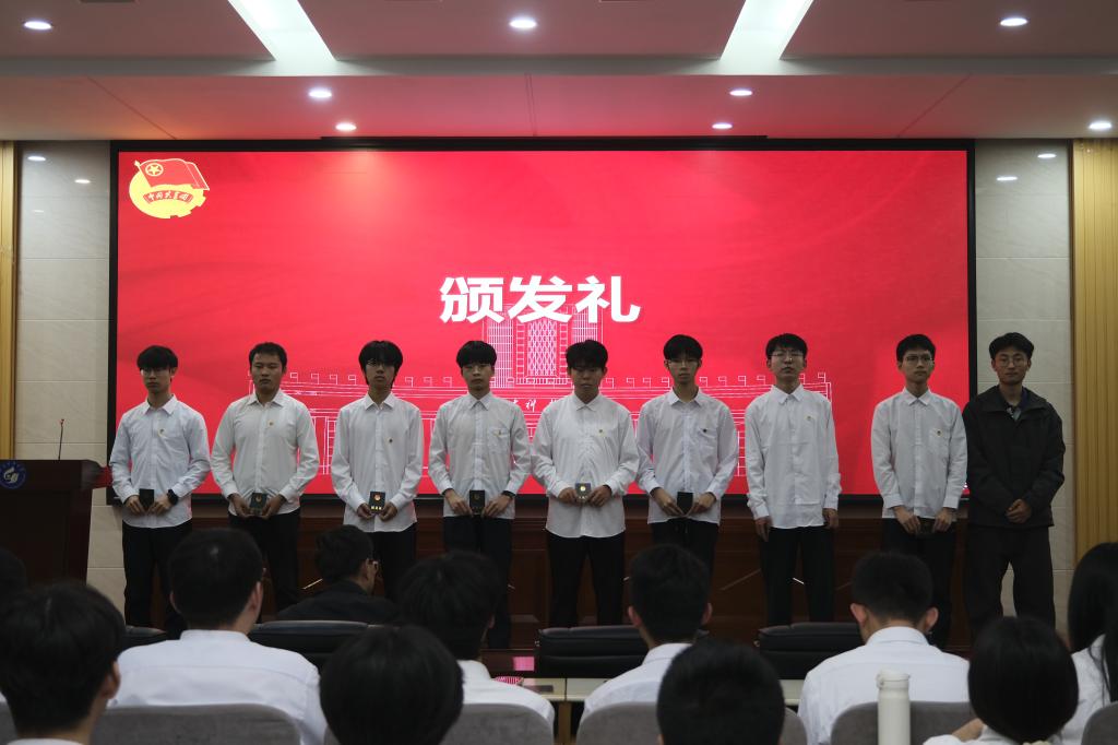 仪式在庄严的《义勇军进行曲》中拉开帷幕,全体师生肃立齐唱国歌。秦梦带领全体新发展团员学习《团章》核心内容,明确共青团员的身份认同与责任担当。张凯宣读新发展团员名单,23名青年学子经过思想考核、组织考察等层层考验,正式成为中国共产主义青年团的一员。东玉涛为新发展团员颁发团员证并佩戴团徽。当金黄色的团徽在胸前闪耀,新团员们挺直身姿,眼神坚定。