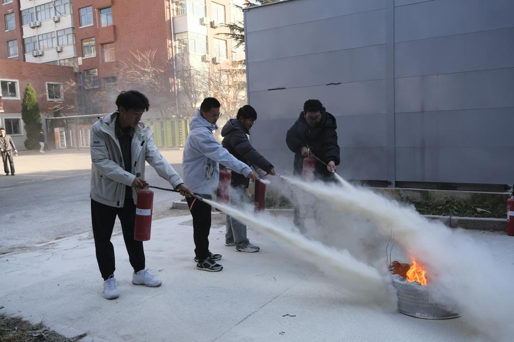 疏散环节结束后,学校安管处工作人员现场讲解了灭火器、消防栓等常用消防器材的正确使用方法。在确保安全的前提下,同学们以四人为一组,依次进行了灭火实操练习。整个过程中,大家认真聆听讲解,积极参与实操,切实掌握了基本的灭火技能。