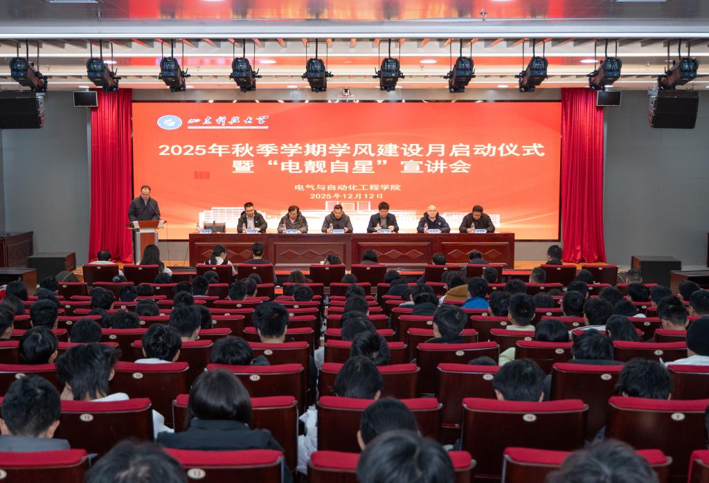 12月12日,电气与自动化工程学院2025年秋季学期学风建设月启动仪式暨“电靓自星”宣讲会在求新讲堂举行。学院党委书记庄立臣,党委副书记兼副院长赵洋,副院长周封、朱延正,院长助理于永进、盛春阳出席仪式,教师代表、2025级班主任、全体辅导员和学生代表约360人参加。仪式由学工办主任(团委书记)杨洪骞主持。