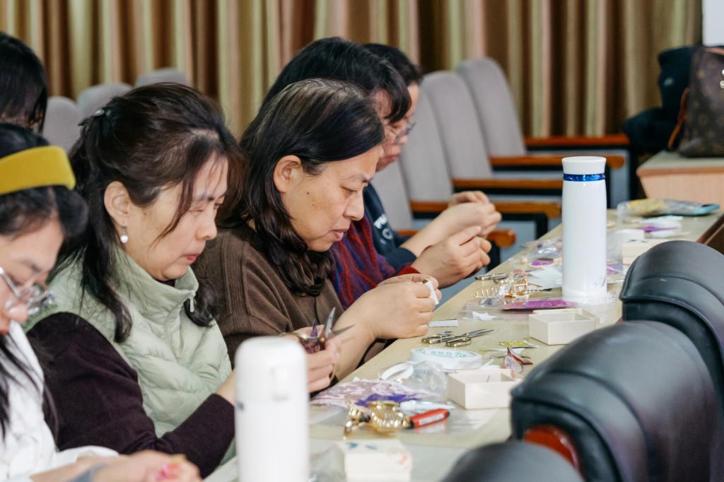 走进活动现场,温馨雅致的氛围扑面而来。平日里忙碌于讲台和实验室的女教职工们,此刻暂时放下繁重的工作,静下心来感受指尖上的艺术。裁剪、拼接、粘贴、固定……素净的饰品经巧手装点,焕发出古朴雅致的韵味,恰如女性温柔而坚韧的力量。很快,一枚枚宋锦饰品成型,抓夹灵动、发夹精致、胸针典雅。大家手持作品合影,定格节日美好瞬间。