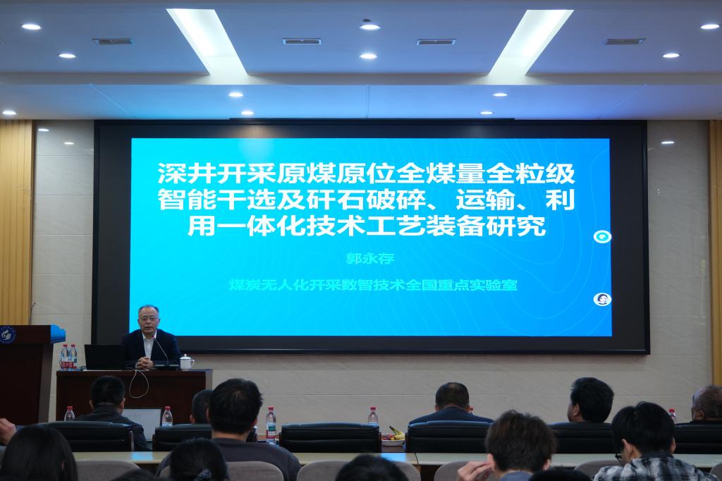 郭永存以“深井开采原煤原位全煤量全粒级智能干选及矸石破碎、运输、利用一体化技术工艺装备研究”为题,详细介绍了深井开采条件下的智能干选技术与矸石处理新工艺,展示了从理论到装备的成套解决方案。