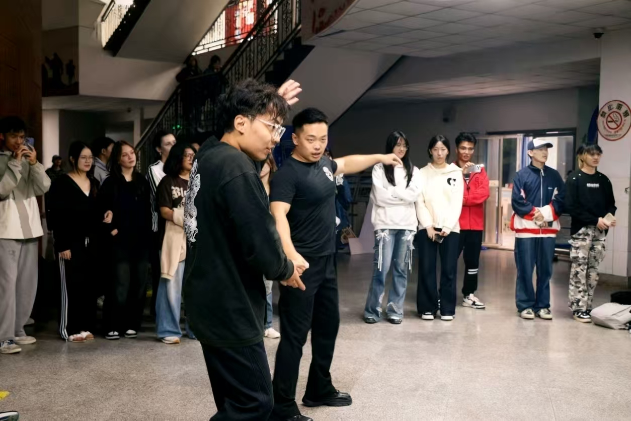 在教学环节,张倩、刘恒瑞、王宏业、乔一桓四位同学依次登场,分别负责不同舞种的教学工作。张倩从jazz的基本动作切入,引导大家学习经典舞蹈《nobody》的片段;刘恒瑞以popping的基础律动为起点,详细讲解相关元素并精心编排了舞蹈片段供大家练习;王宏业凭借幽默风趣的教学风格,对locking元素进行细致拆解,成功带动了现场的欢乐氛围;乔一桓则从breaking的基本步伐教起,通过编排舞蹈片段帮助大家快速入门。活动临近尾声时,全体参与者热情不减,纷纷积极分享交流自己在活动中的收获与心得体会。