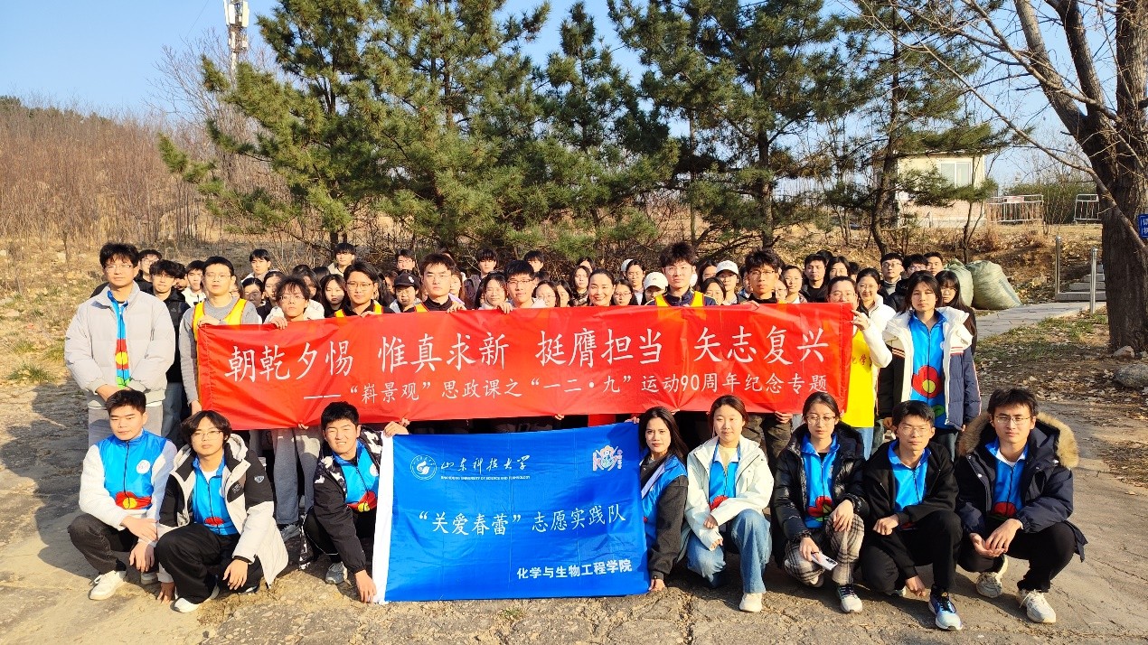 12月9日,恰逢“一二·九”运动90周年纪念日,山东科技大学“嵙景观”思政课之“一二·九”运动90周年纪念专题课程在校内笔架山开讲。这次课程以“朝乾夕惕,惟真求新,挺膺担当,矢志复兴”为主题,由化工学院团委书记兼学工办主任易凡主讲,学院辅导员李玲玲、郝俊英、学生党支部及各学生组织代表百余人参加了课程。师生一道徒步笔架山,上了一堂“行走的”沉浸式思政课。