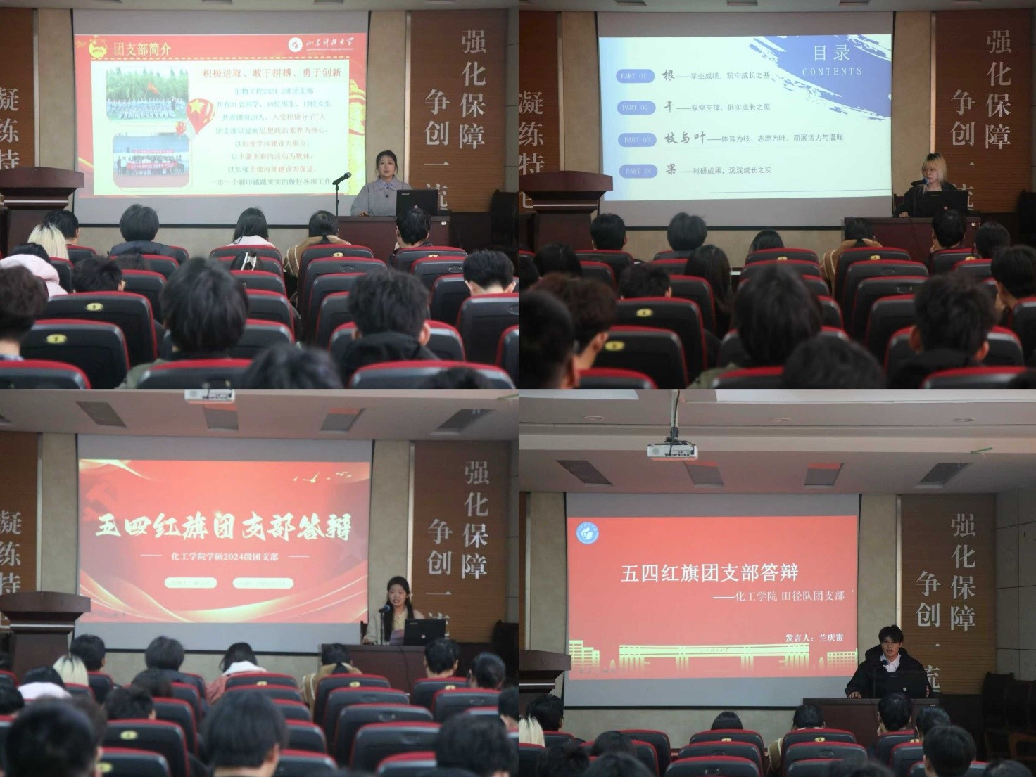 在五四红旗团支部答辩环节,生物工程2024-2班团支部、研究生2024学硕团支部、生物工程2023-2班团支部及田径队团支部依次进行汇报,围绕思想引领、组织建设、活动开展等方面展示支部工作成效与特色。