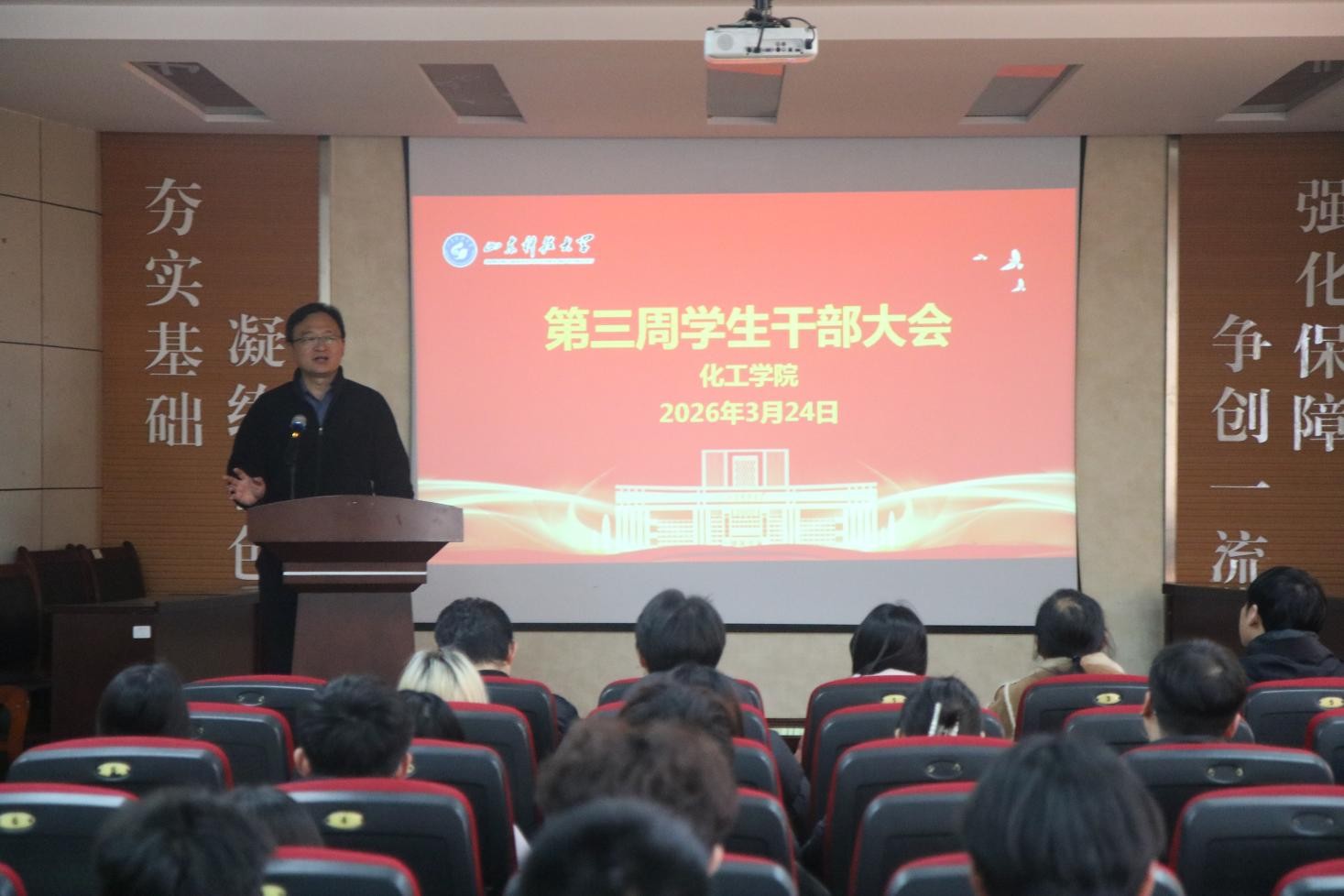 3月24日,化工学院在J2-104召开学生干部大会暨五四红旗团支部答辩。学院党委副书记兼副院长陈永磊、团委书记易凡、各年级辅导员及全体学生干部参加会议,会议由易凡主持。