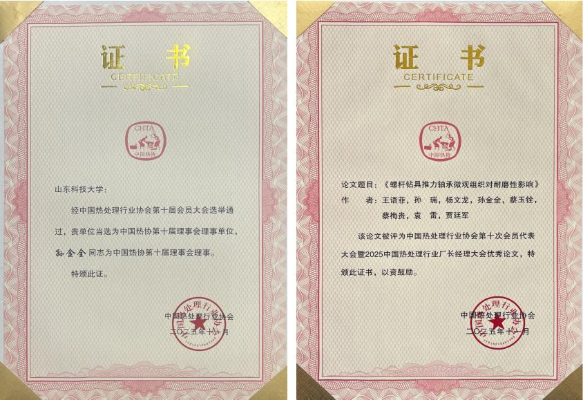 11月25日在第十届理事会选举中,山东科技大学当选为中国热处理行业协会理事单位(2025-2030年度);材料科学与工程学院孙金全教授当选为中国热协第十届理事会理事。11月26日大会总结“十四五” 发展成就、部署“十五五”规划,安排两场前沿技术报告,并同步举办 7 场专业分论坛,覆盖高端轴承材料与热处理等多个领域。在同期举办的第三届高端轴承材料与热处理专题论坛上,材料工程专业 24-3 班硕士研究生王语菲作了题为“螺杆钻具推力轴承失效分析与性能提升”的专业分论坛报告。此外,《螺杆钻具推力轴承微观组织对耐磨性影响》一文,获评大会“优秀论文”。