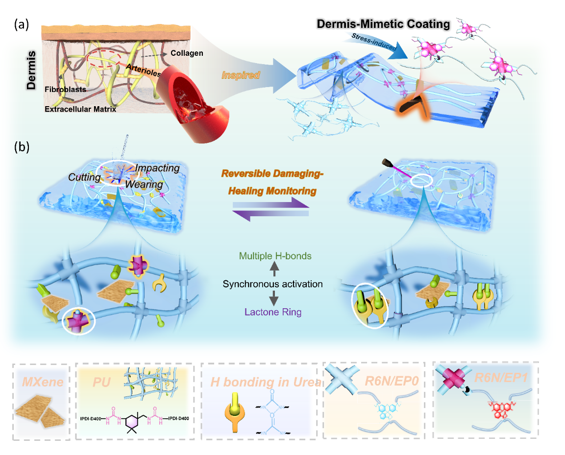 研究成果以“Dermis-Inspired Multimodal and Reversible Damaging-Healing Monitoring Coating via Dynamic Bonding Synchronous Activation Strategy”为题发表于国际知名学术期刊《Advanced Functional Materials》(IF=19)上。文章第一作者为2025届硕士研究生焦德志(现为南京理工大学博士研究生),我院刘成宝博士、南京理工大学傅佳骏教授为通讯作者。本研究工作得到了国家自然科学基金、山东省自然科学基金等项目的大力资助。