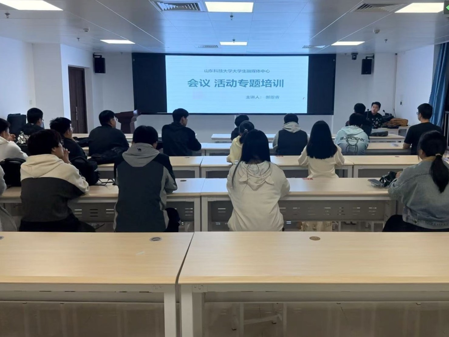 培训中,郝恩睿围绕新闻摄影的实用价值展开讲解,结合宣传工作实际,强调摄影技能在提升新闻传播效能、展现校园风貌及促进个人综合发展中的重要意义。技术讲解环节,他明确了“主题清晰、主体明确、信息正面、画面整洁”四大摄影标准,并结合实例分享多场景实操技巧:会议拍摄采用侧面取景、先竖后横策略;人物拍摄聚焦神态细节,中景抓开场30秒关键;小型会议兼顾构图对称与动作协调;集体合照注重布局平稳,建议腰部以上取景并确保重要人物表情、视线统一。