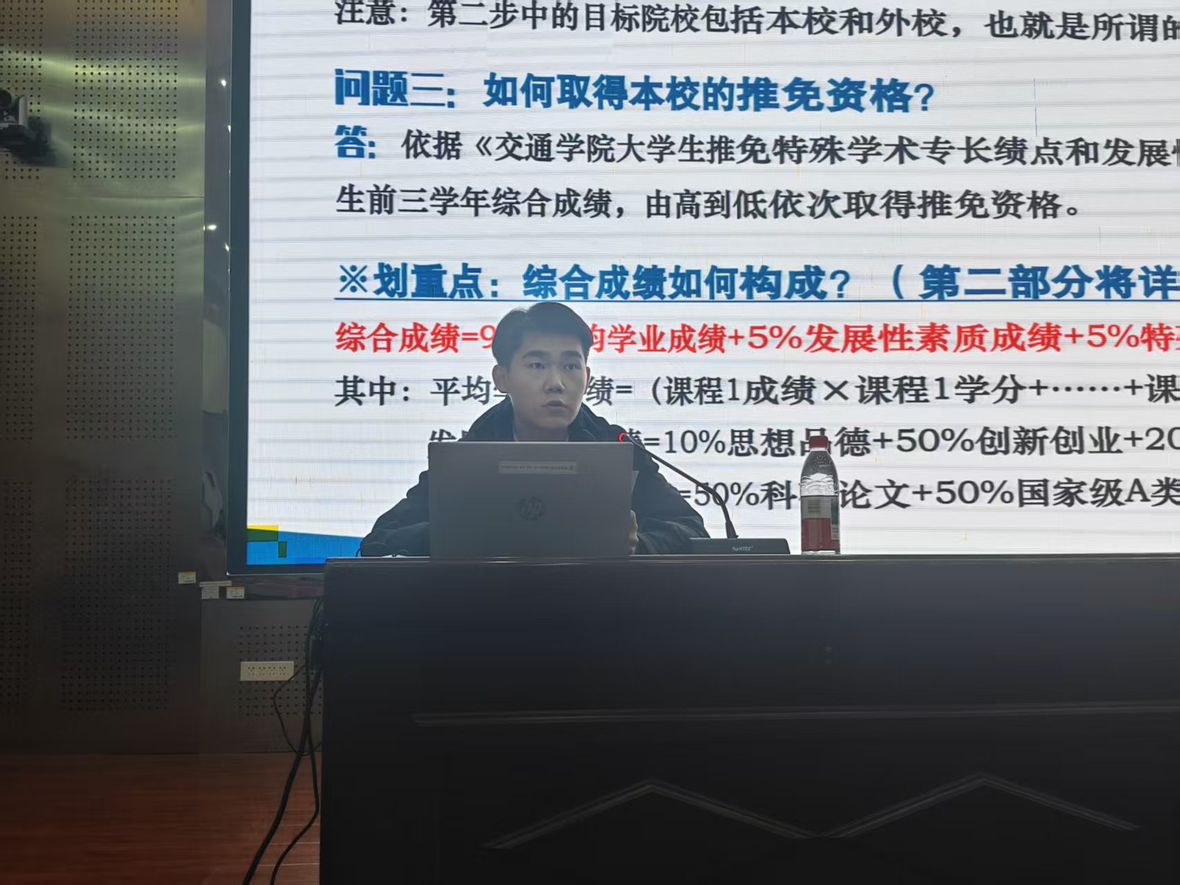 为帮助学生解答保研疑惑、明确学业发展方向,交通学院在J1-121教室成功举办“禾斗讲堂”第36期保研经验分享会。活动特邀交通运输2022级、已推免至山东大学的陆星宇担任主讲。