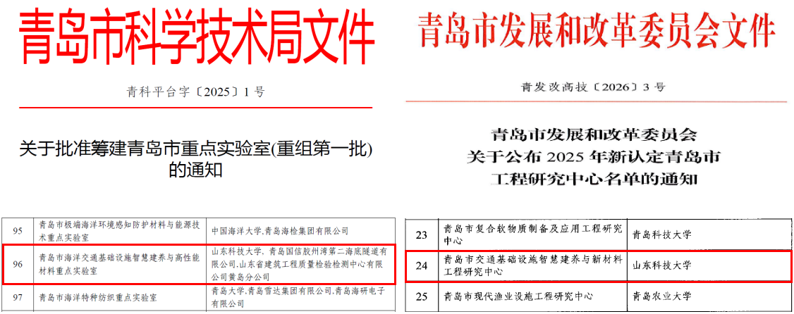 近日,青岛市科技局、青岛市发展和改革委员会分别发布了《青岛市重点实验室重组(第一批)拟批复筹建名单》(青科平台字〔2025〕1号)和《关于公布2025年新认定青岛市工程研究中心名单的通知》(青发改高技〔2026〕3号),由我院牵头申报的“青岛市海洋交通基础设施智慧建养与高性能材料重点实验室”和“青岛市交通基础设施智慧建养与新材料工程研究中心”均获批建设。