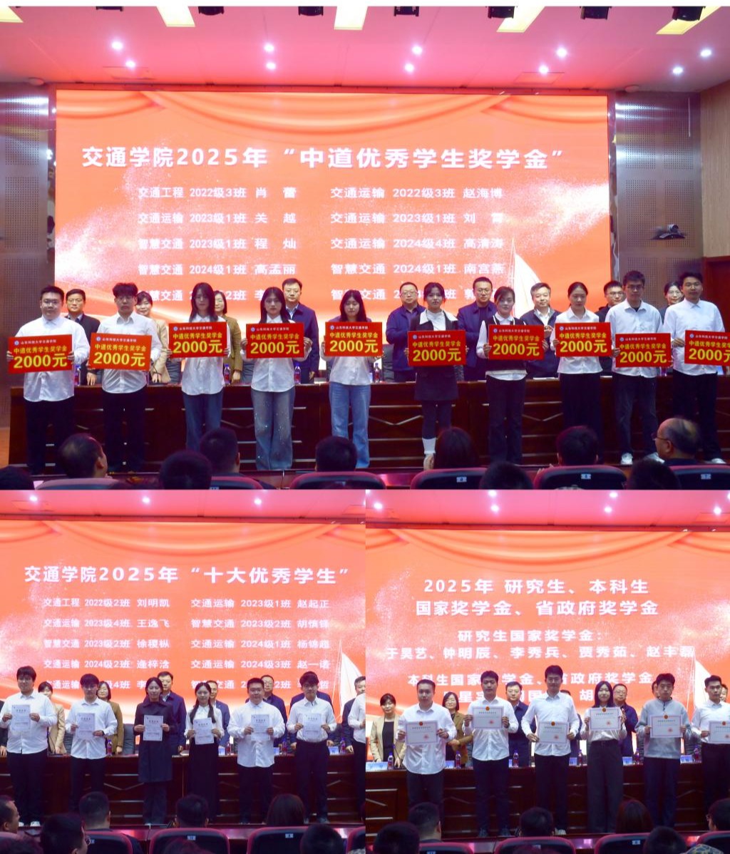 会上,交通学院副院长孟坤宣读了《交通学院2026年“立德树人,知行合一”教风学风建设年活动方案》,明确了本年度围绕教风学风建设的目标任务、重点举措与长效机制,交通学院学工办主任、团委书记刘倩婧宣读了《2025年度交通学院关于中道消防优秀学生奖学金及十大优秀学生表彰决定》,以及国家奖学金、省政府奖学金获奖人员名单。与会领导和嘉宾向获得表彰和奖学金的同学进行颁奖并合影留念。