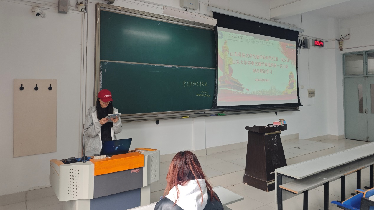 在视频学习环节,全体党员认真学习了习近平总书记给四所交通大学全体师生的回信精神,深入领会传承弘扬西迁精神、服务国家战略、加强科技创新与人才培养的重要要求。领学环节,山东科技大学交通学院研究生第一党支部书记董志远以“根脉相连、薪火相传”为主题,系统解读了西迁精神的内涵实质与时代价值,引导党员坚定听党话、跟党走,自觉将个人发展融入国家事业大局。在交流分享环节,两院党员代表结合科研方向与支部工作实际,围绕精神传承、服务战略、支部共建等主题展开热烈讨论,分享学习体会与实践思考。