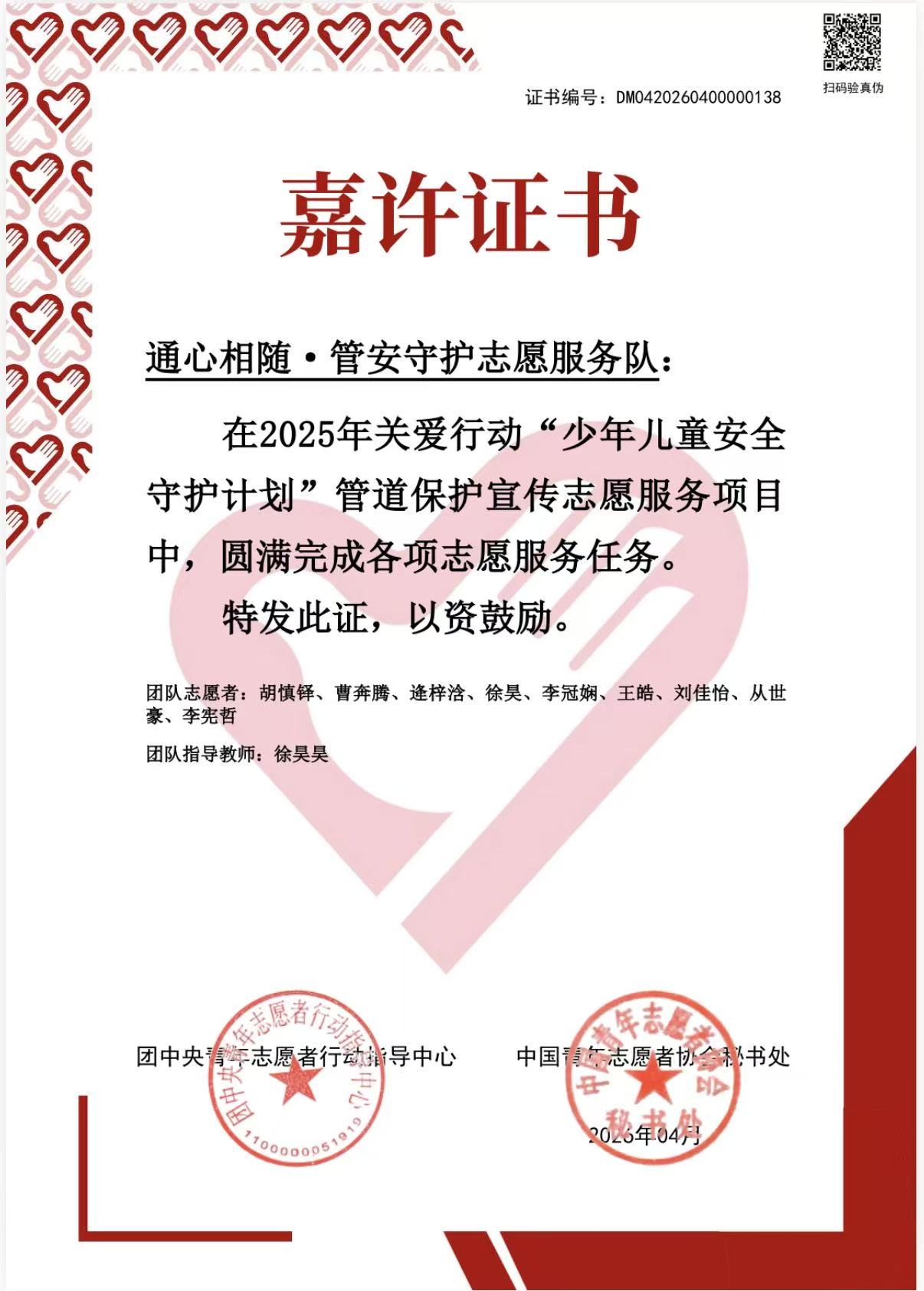近日,在2025年关爱行动“少年儿童安全守护计划”管道保护宣传志愿服务项目评选中,山东科技大学“通心相随·管安守护”志愿服务队表现突出,从全国1000支团队中脱颖而出,荣获团中央嘉许证书,成为全国仅有的100支获奖团队之一。