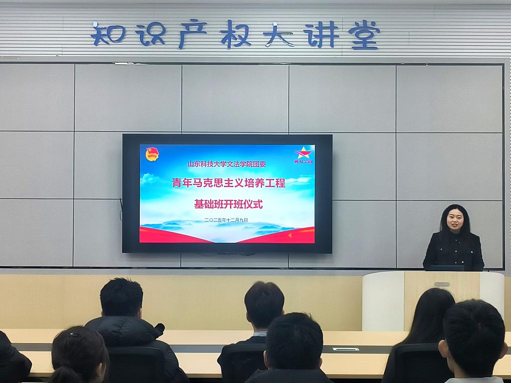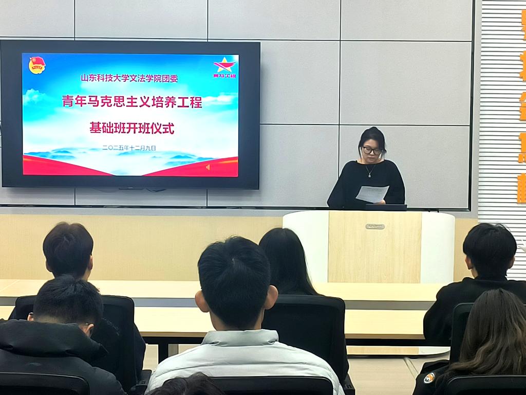 仪式上,辅导员曹严心宣读《文法学院第7期青年马克思主义者培养工程基础班工作方案》,从培养目标、课程设置、实践安排等方面明确了本期青马班的核心任务与实施路径。学院团委书记郭婷婷对全体学员表示了祝贺,强调了新时代深入实施“青马工程”的重要意义,并希望学员做信仰坚定的“追光者”,深学马克思主义经典著作与党的创新理论;做勤学善思的“笃行者”,深耕专业知识、勇于创新,将理论融入社会实践与志愿服务;做道德风尚的“领头雁”,严于律己,以担当奉献引领青年风尚。