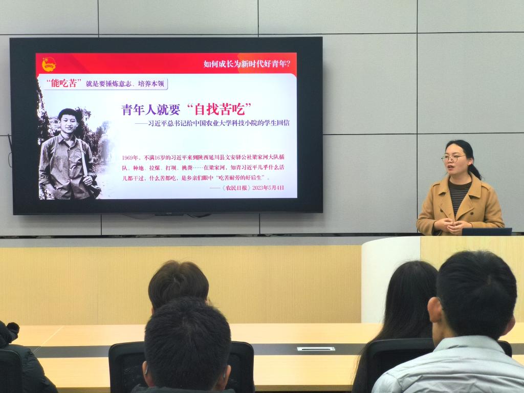 学院团委辅导员王晓迪为团员青年讲授了一堂主题为“以青春之力助力中国式现代化”的团课,围绕“什么是中国式现代化”“中国式现代化的特征”以及“青年一代的使命与担当”等方面展开,并对新时代共青团员和广大青年提出三点期望:一是自信自强,做理想坚定、无私奉献的新青年;二是玉汝于成,做勤奋进取、踔厉奋发的新青年;三是君子不器,做敢为人先、积极进取的新青年。激励大家以青春之我,助力中国式现代化建设。
