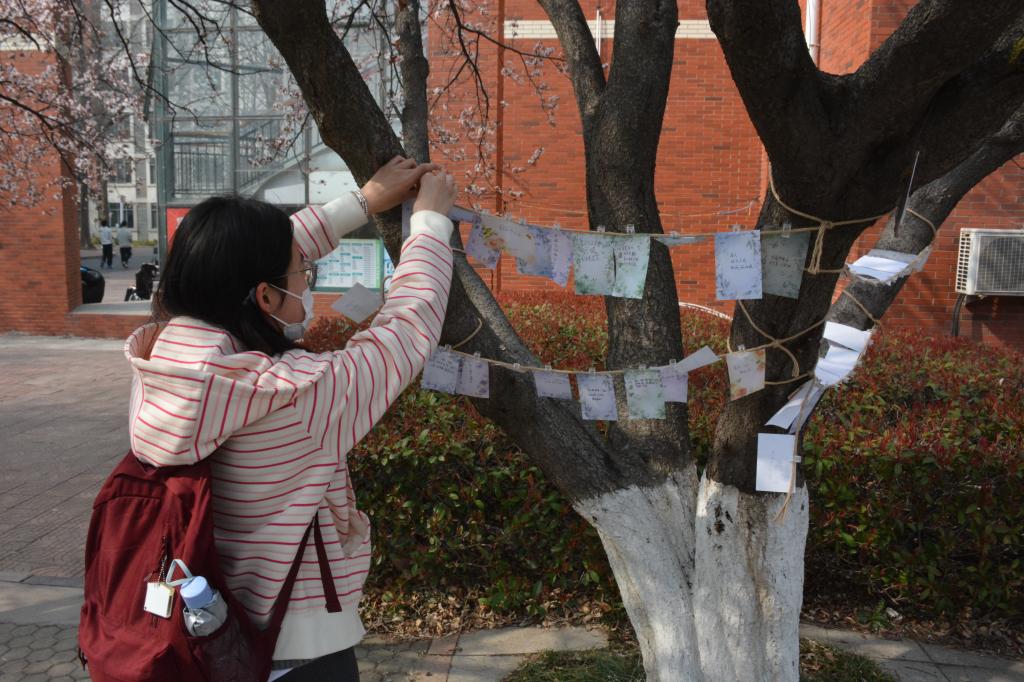 春意盎然,生机勃勃的校园为本次心理活动营造出清新自然的氛围。活动现场,同学们有序地自主领取创作物料,在花朵便利贴上抒发内心感受:有的同学写下当下的心情感悟,有的描绘校园春日的美丽景致,还有的写下对自己的温暖寄语。同学们将内心的所思所感化作笔尖流淌的温情文字,将这份独属于自己的“春日心情”夹在展示绳上。一张张缤纷的花朵便利贴相互串联,形成了一面温馨的“春日心情栏”。