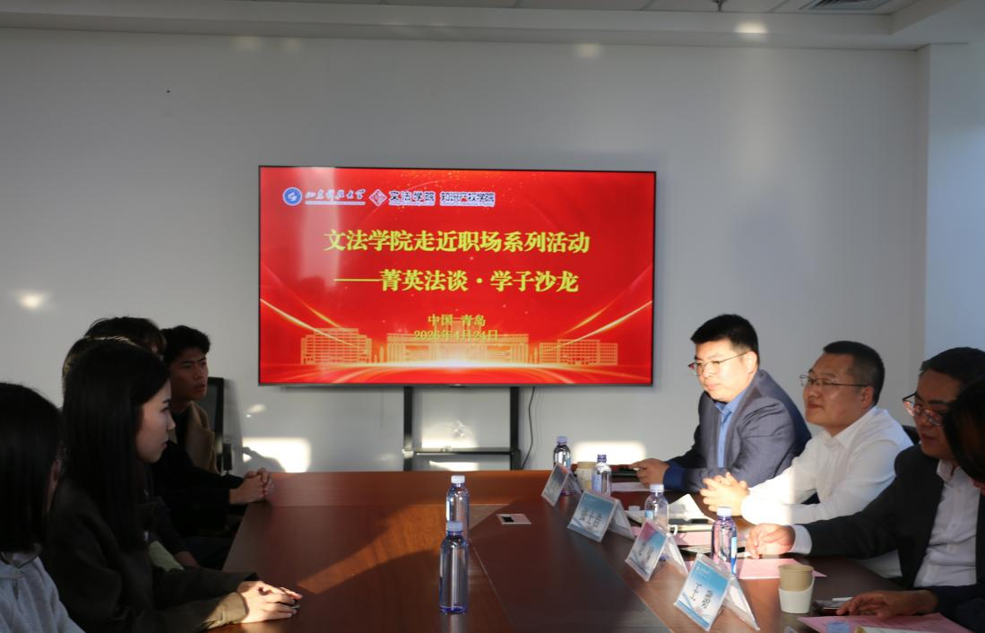 为深化校地协同育人,引导学生明确职业方向,提升职场适应能力,4月24日,文法学院走近职场系列活动——菁英法谈·学子沙龙在山东科技大学青岛校区图书馆1328室成功举办。青岛市律师协会副会长楚啸,刑诉委主任王璐、副主任张士浩,副秘书长沈彦敏等资深律师受邀出席活动。学院副院长刘振山、单娟,法学系主任吴立志,法学第一党支部书记刘兵及师生代表共同参与。