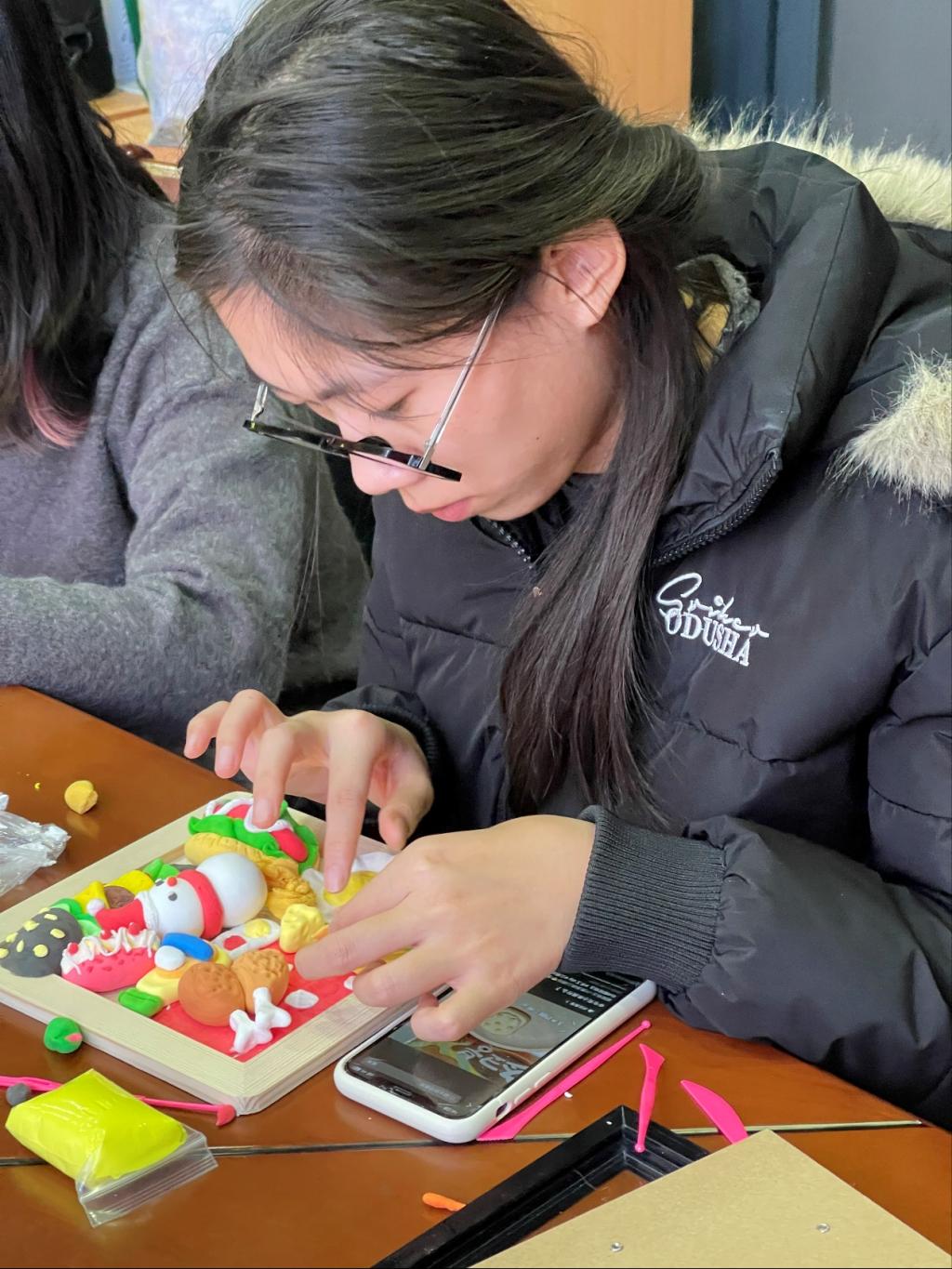 活动团队提前筹备了色彩丰富的粘土、精细塑形工具及多规格相框。活动现场以多彩粘土装饰,并配合舒缓音乐,为参与者营造了轻松的创作环境。学子们充分发挥创意,独立构思者以明快色彩诠释愉悦心境,结伴协作的同学则在交流中碰撞出独特灵感。创作过程中,焦虑与压力随粘土塑形逐步消解,形态各异的作品相继呈现:圆滚可爱的 “情绪小怪兽”、质感逼真的粘土美食、搭配奶酪块的圣诞雪人等作品,均生动展现了创作者的巧思。