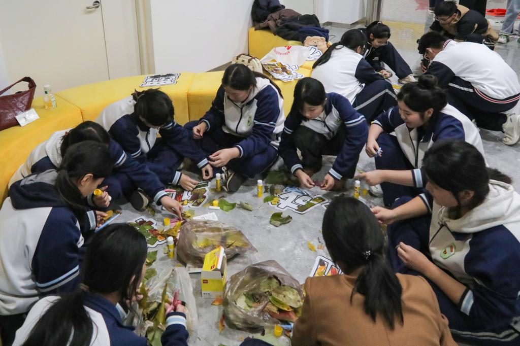 大中小学生共同拼制“红蓝筑梦 携手成长”落叶字