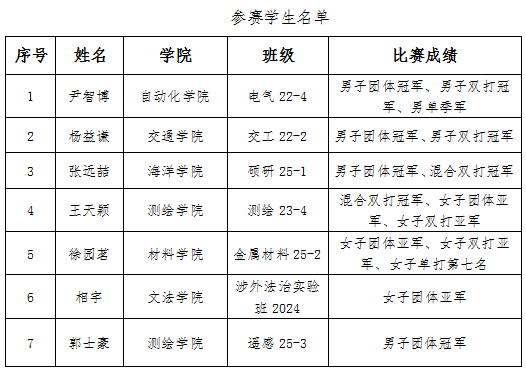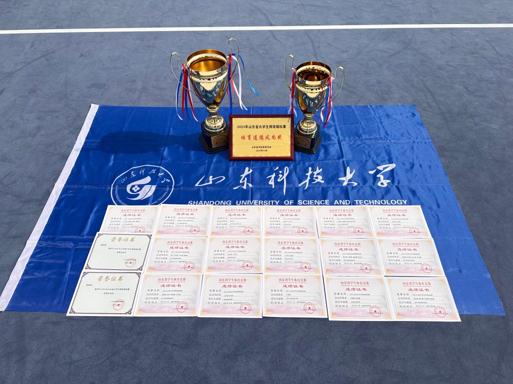 1020日至25日,山东省大学生网球锦标赛在威海临港海思网球中心圆满落幕。我校网球队教练员王焕盛、张传来老师指导下参加了甲组比赛,队员们利用课余时间认真训练,积极备战;比赛中,不畏强手,顽强拼搏,克服一日多赛的身心疲惫比赛后,复盘比赛过程,及时总结调整。经过激烈比拼,我校网球队获得甲组男子团体冠军、男子双打冠军、混合双打冠军、女子团体亚军、女子双打亚军、男子单打季军、女子单打第七名等优异成绩。学校荣获“体育道德风尚奖”。交通学院杨益谦和材料学院徐园茗获评“优秀运动员”。