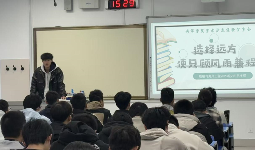 为激发学生创新思维,搭建科创交流桥梁,近日,海洋学院举办科创沙龙活动。活动邀请了2022级学生孙敬臣和2023级学生仇宇桐分享经验。