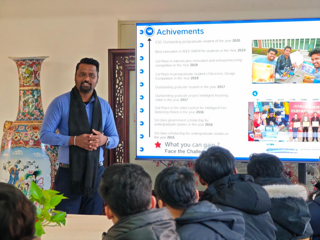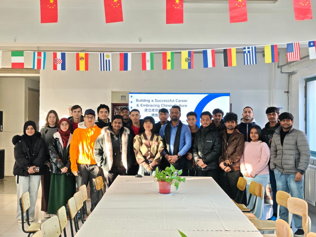 在校期间,阿米拉以“打造职业生涯,拥抱中华文化”为题,为在校国际学生带来专题报告。报告中,他结合自身从初级工程师成长为企业经理助理的职业进阶历程,分享了“活到老,学到老”的成长箴言。他强调,职场竞争力需兼顾硬技能与软技能的双向提升,既要深耕专业知识,筑牢职业根基,也要锤炼沟通协作、领导力等综合能力。谈及在母校的求学时光,他感慨道:“在山科的岁月,不仅让我收获了扎实的专业知识,更培养了我的国际视野与跨文化交流能力。”他鼓励学弟学妹们主动融入中国式学习生活,以规律作息涵养自律品格,充分利用学校优质教育资源,全面提升专业素养与跨文化沟通能力。