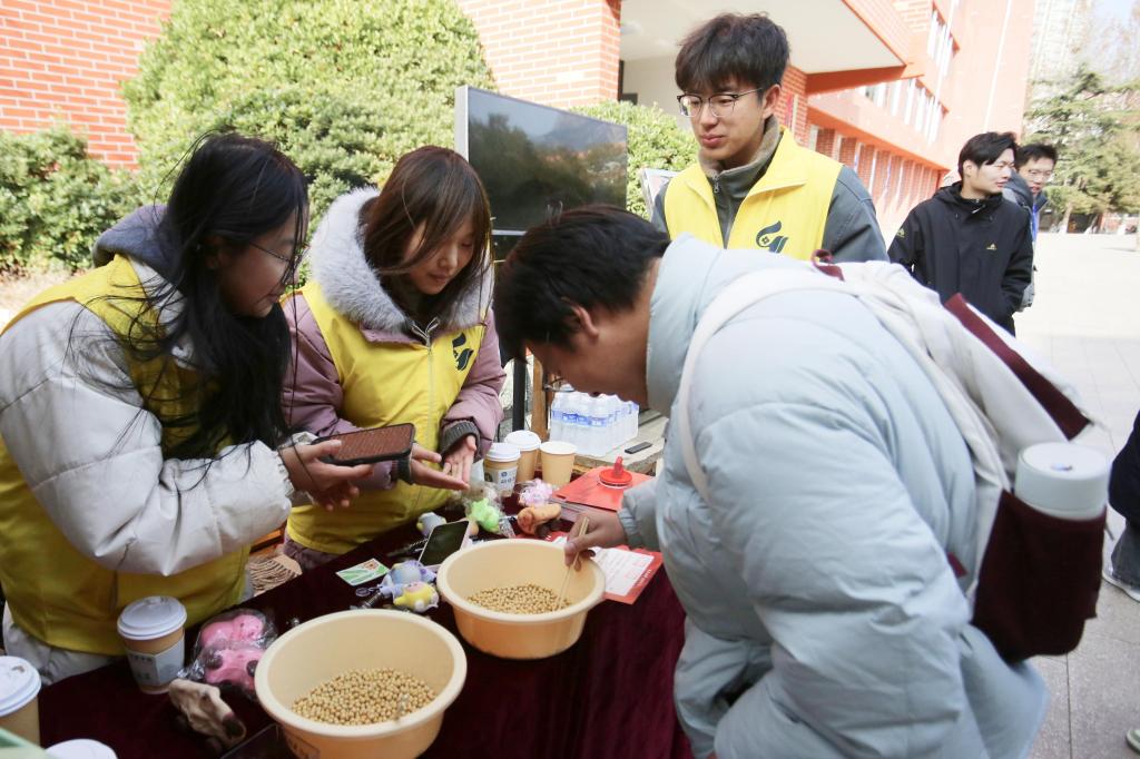活动现场,一场“巧夹金豆”的小游戏让气氛活跃起来。同学们手持竹筷,屏息凝神,在20秒内专注而轻盈地夹取金豆,仿佛也将备考期间的紧张与专注凝聚在了这方寸之间。随后递来的定制版“录取通知书”,令许多同学眼中一亮,笑意浮现。金豆落盒的清脆声响,如同轻快的前奏,驱散了备考的紧张——学院的关怀不显山露水,却恰如这份恰到好处的鼓舞,无声胜有声:你们,一定行!