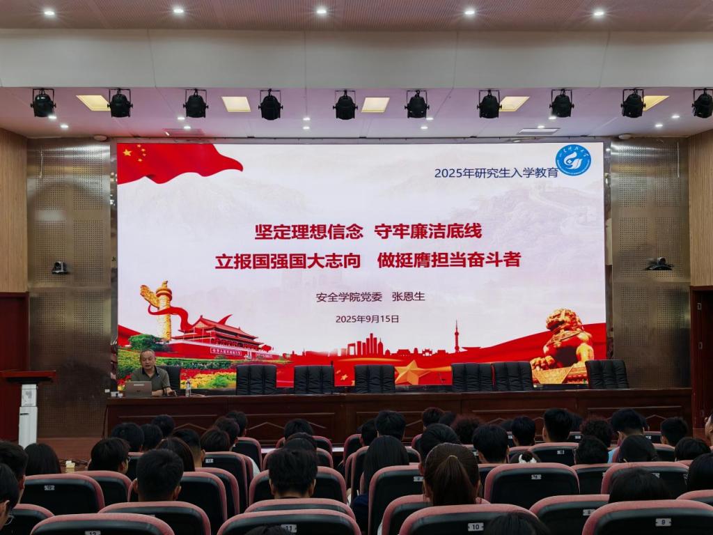 为深入学习贯彻党的二十大和二十届二中、三中全会精神,推动深入贯彻中央八项规定精神学习教育常态化长效化,9月15日,安全学院在J9-144报告厅举行2025级研究生新生入学教育专题活动,院党委书记张恩生作题为“坚定理想信念,守牢廉洁底线,立报国强国大志向,做挺膺担当奋斗者”的专题报告。