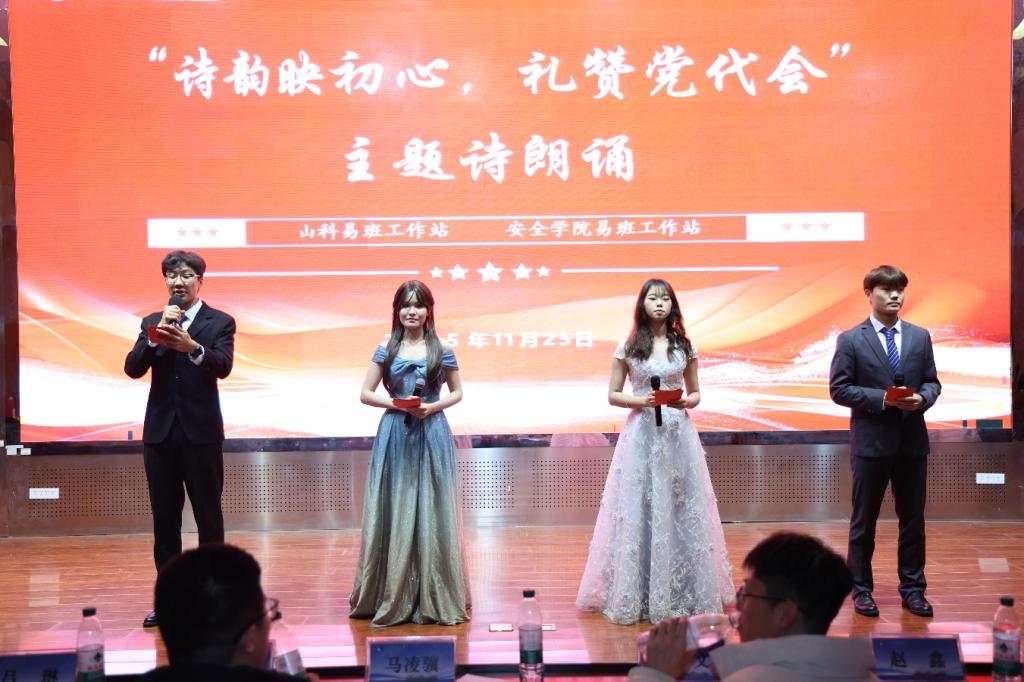 为深入学习贯彻山东科技大学第四次党代会精神,11月25日,安全学院易班工作站于J9-144报告厅举办“诗韵映初心,礼赞党代会”主题诗朗诵大赛。活动特邀外国语学院赵鑫、能源与矿业工程学院马凌骥、机械电子工程学院马文豪、地球科学与工程学院杜中文、电子信息工程学院吕琳、安全与环境工程学院王雪霏、居硕等多位老师出席大赛。
