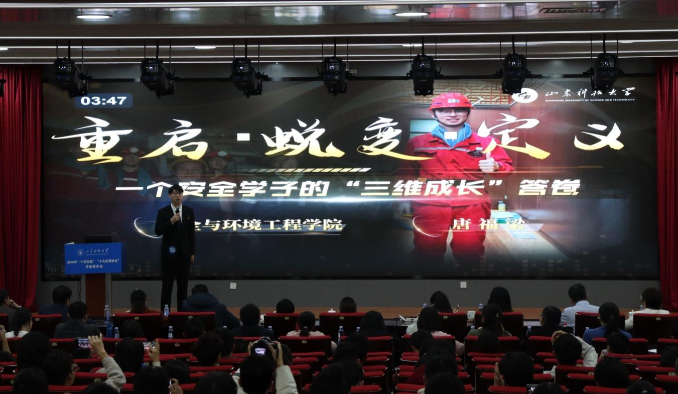唐福梁,中共党员,安全学院安全工程2022级5班班长。他以“重启·蜕变·定义”为题讲述了一个安全学子的“三维成长”答卷。思想铸魂育本色,参与思政活动60余次,入选青马工程弘毅班,作为正式代表参加学校团代会,现已成为一名中共党员。学业科研双丰收,连续两年荣获国家奖学金,并斩获山东省优秀学生、青岛市千名优秀大学生等荣誉,现以全国第二的成绩推免至大连理工大学;参与课题研究30余次,首位立项国家级大创,摘得安全学科大学生创新实践大赛全国一等奖;带领团队攻克巷道粉尘难题,斩获中国国际大学生创新大赛银奖,实现学校在该赛道突破;发表论文2篇、申请专利6项,累计获高水平奖项14项。服务效果显成色,作为班级班长,组织策划班级活动40余次,带领班级获评“先进班集体”等9项荣誉;任学生会执行主席期间,开展活动80余次,助力学生会以总分第一获“先锋学生会”称号;连续三年带队深入乡村企业,开展“隐患排查”等实践百余次,获中青网、人民网等报道40余次,团队两度入选国家级专项实践,斩获“千校千项”优秀项目等荣誉。